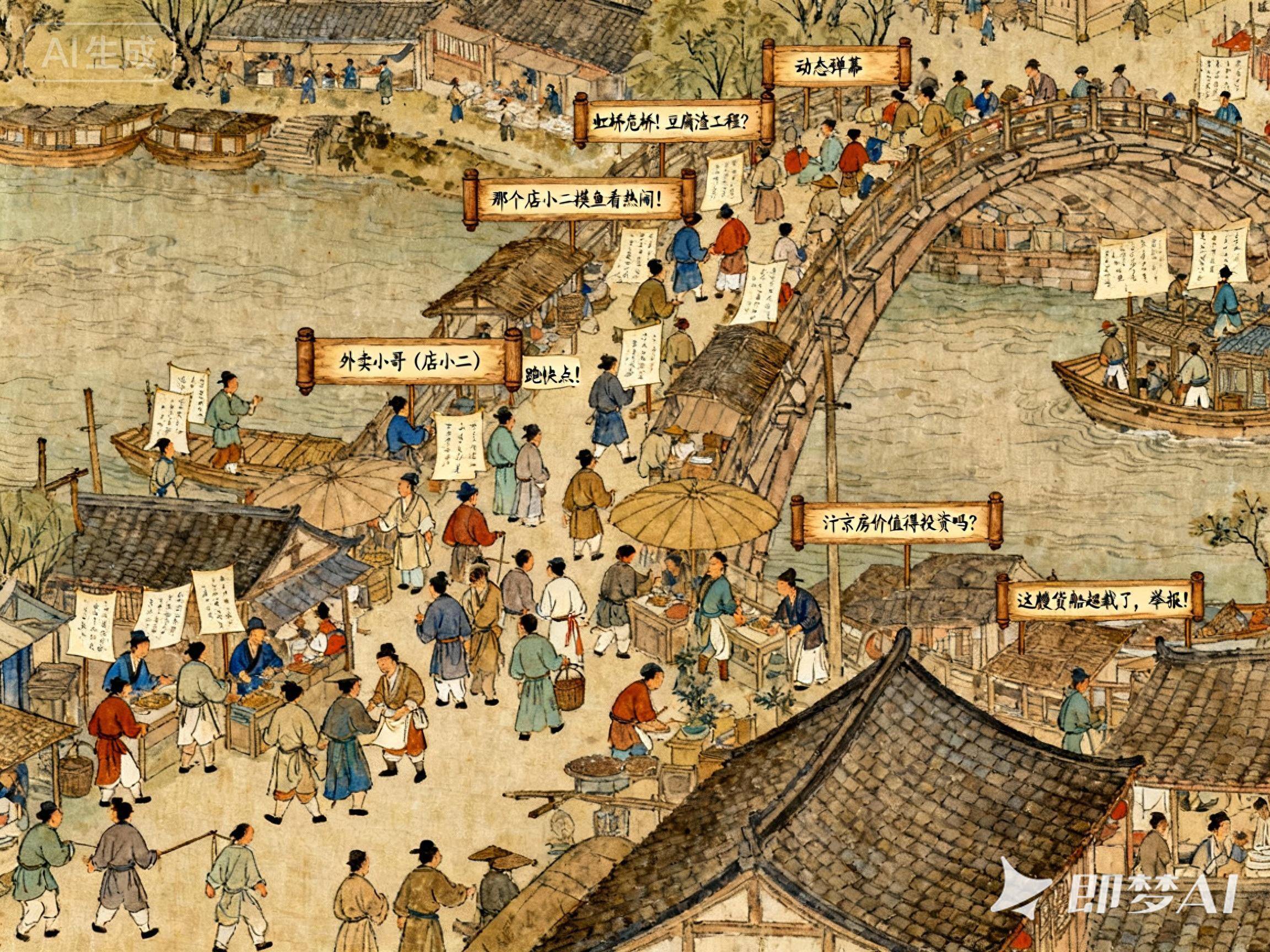 你瞧,有人看到虹桥,忍不住吐槽:“虹桥危桥!豆腐渣工程?”看到店小二在那儿闲着,就喊:“那个店小二摸鱼看热闹!”还有催着送外卖的:“外卖小哥(店小二)跑快点!”甚至有人琢磨起投资:“汴京房价值得投资吗?”看到货船,又操心起来:“这艘货船超载了,举报!”……