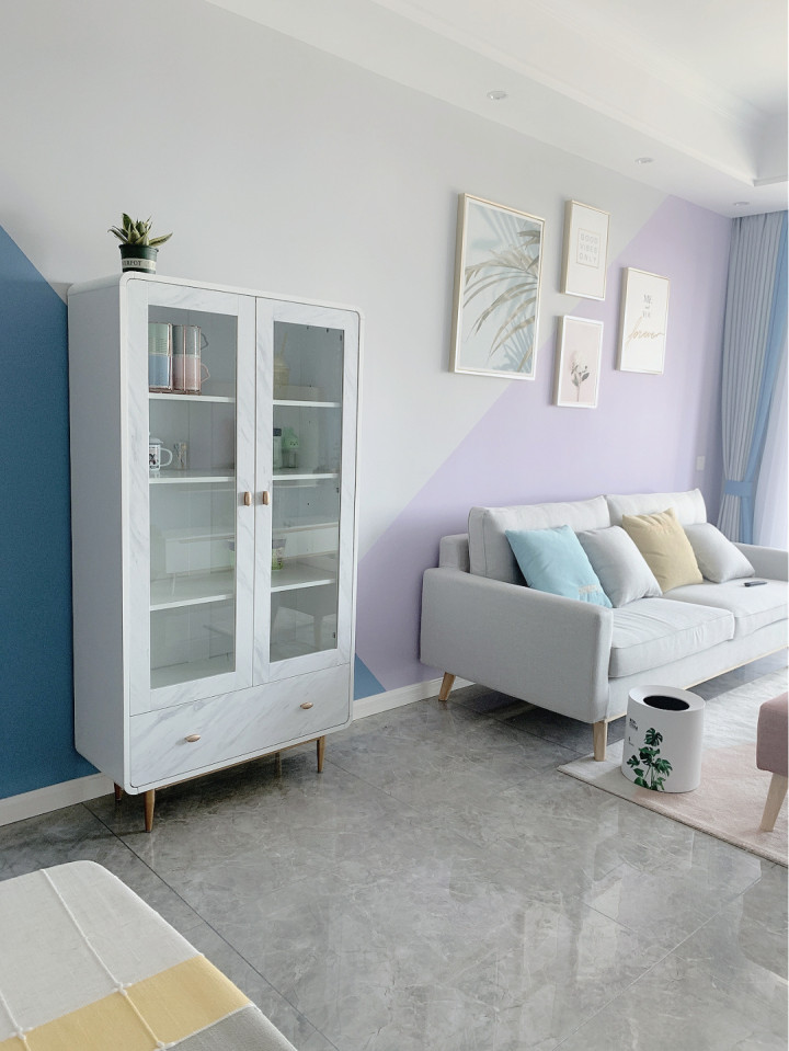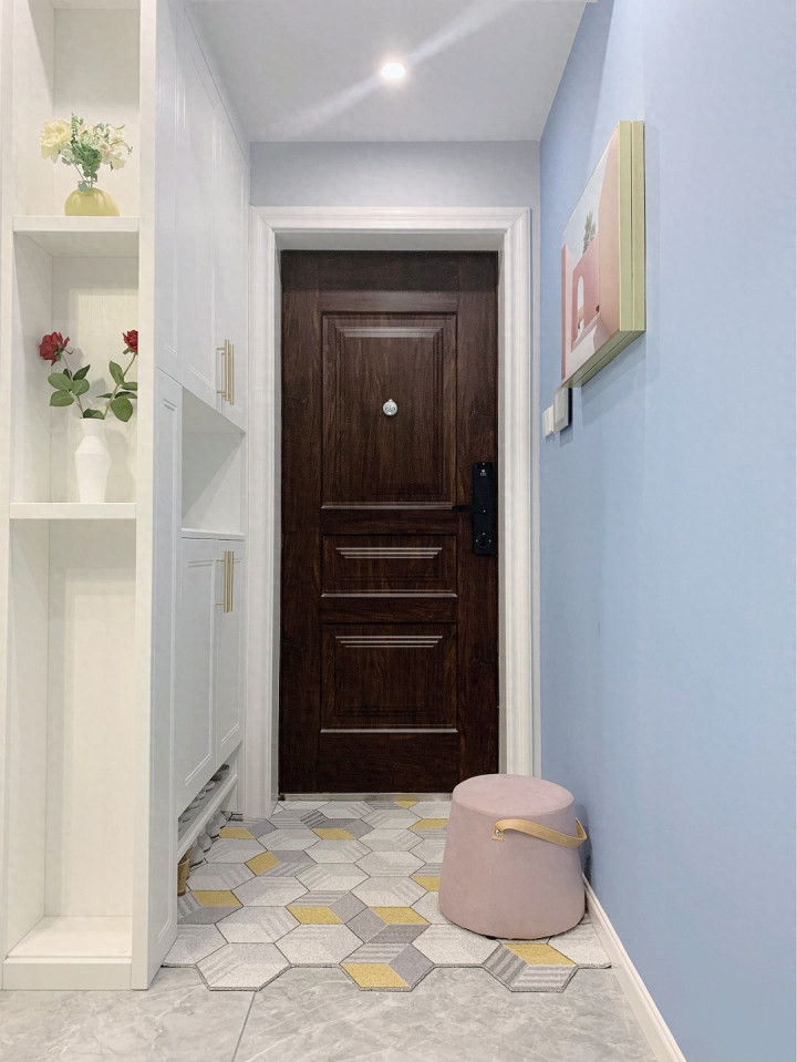 入户的玄关空间,其实刚入门就被简单的装饰给迷住了,比如墙面上灰蓝色的色调装饰,白色的鞋柜以及地面上做了蜂窝型的瓷砖搭配,整体上实用又好看,颜值也高。