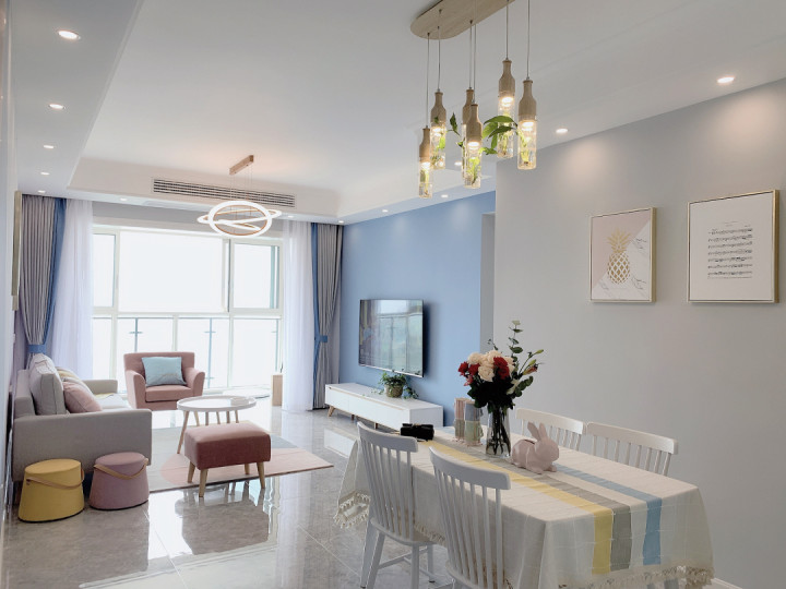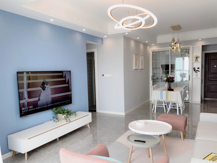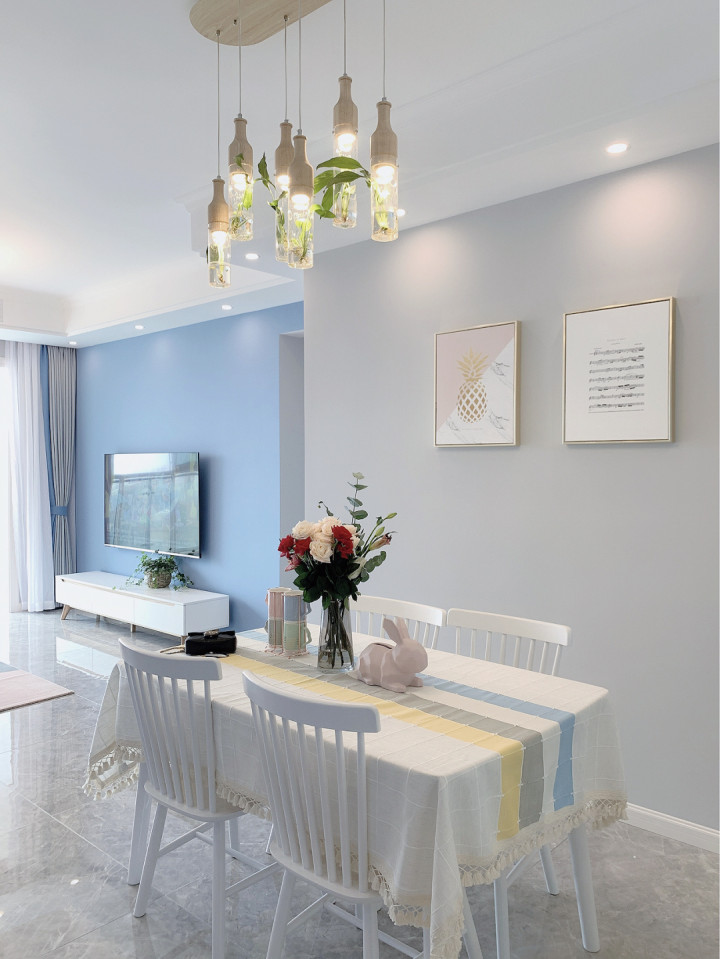 从玄关的位置看到室内的餐厅和客厅的整体,色彩的搭配确实很舒适,电视背景墙的蓝色,餐厅背景墙的灰色,以及各种家具的色彩搭配,呈现出来的感觉确实让人很喜欢,亲戚来家里餐馆都说羡慕我家可以这么简单又好看。